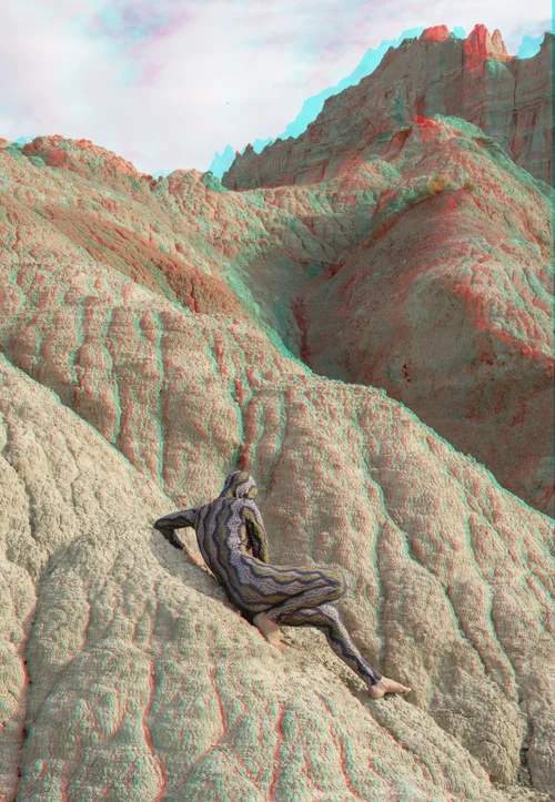 This series portrays human figures wearing botanically-patterned costumes interacting with the natural world in curious and surreal ways. Botany eyes is a term used by botanists to describe the ability to “see” or differentiate plants, after careful study. What once looked like a confusing mass now reveals itself as individual species in an ecosystem. Recognizing plants, ecosystems, and their inhabitants is one step towards protecting and preserving. The figures might be the plants themselves, or our human intervention upon the plants, or an evolved form of future human that interacts with the landscape in new ways.